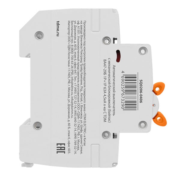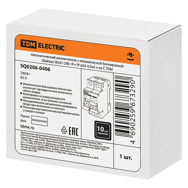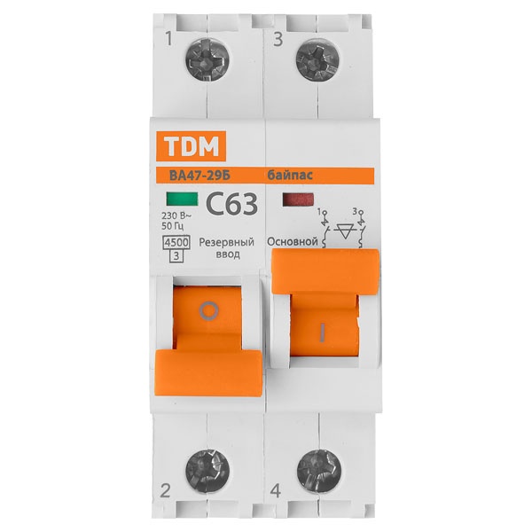 Двухмодульный автоматический выключатель с основным и резервным вводом, механическая блокировка, ток нагрузки 63А, ПКС 4500А, ТДМ SQ0206-0406