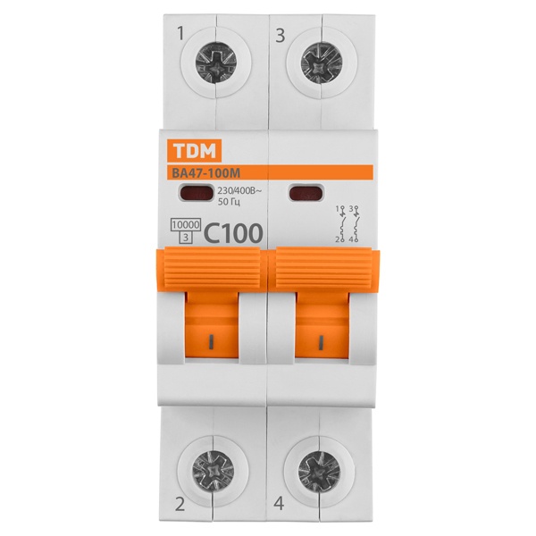 Двухполюсный электрический автомат ВА47-100М ТДМ, номинальный ток 100 ампер уставка С SQ0207-0104