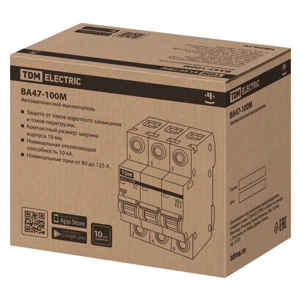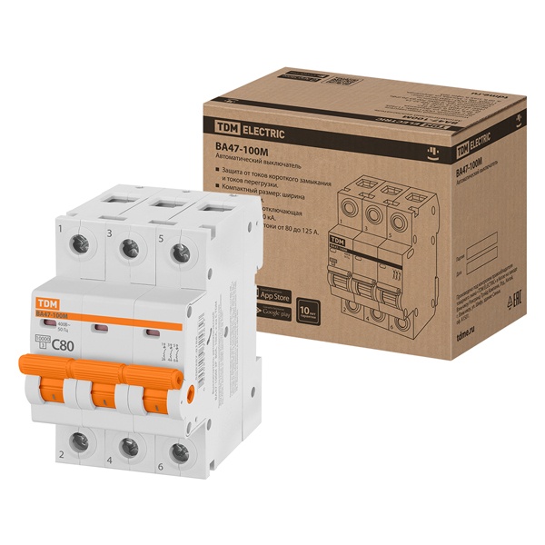 Трехполюсный электрический автомат ВА47-100М ТДМ, номинальный ток 80 ампер уставка С SQ0207-0106