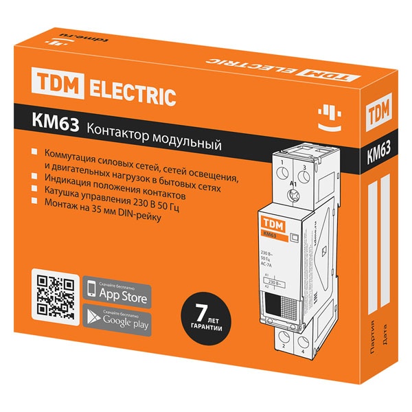 Назначение:Используются для автоматизации и управления различных технологических процессов, в том числе в системах освещения, кондиционирования, вентиляции и т. д. Применение:Автоматика инженерного оборудования: зданий, насосов, систем вентиляции, отопления, освещения и т. д. Преимущества:На лицевой панели реализован механический индикатор положения контактов (включено/отключено), Совместимость размеров позволяет установить контактор в стандартный щиток с любыми аппаратами модульной серии. Защелка на DIN-рейку с фиксацией упрощает монтаж и демонтаж аппарата. Конструкция:Мостиковые контакты обеспечивают высокие электроизоляционные свойства и хорошее гашение дуги при коммутации. Это повышает их износоустойчивость, увеличивает срок службы, уменьшает переходное сопротивление и тепловые потери. Материалы:Корпус и детали аппарата выполнены из пластика, не поддерживающего горение. Упаковка:КМ63/2-20 по 12 шт. КМ63/2-25 по 12 шт. КМ63/2-32 по 6 шт. КМ63/2-40 по 6 шт. КМ63/2-63 по 6 шт. КМ63/4-20 по 6 шт. КМ63/4-25 по 6 шт. КМ63/4-32 по 4 шт. КМ63/4-40 по 4 шт. КМ63/4-63 по 4 шт. Руководство по эксплуатации - 1 шт. на групповую упаковку Паспорт - 1 шт. на групповую упаковку