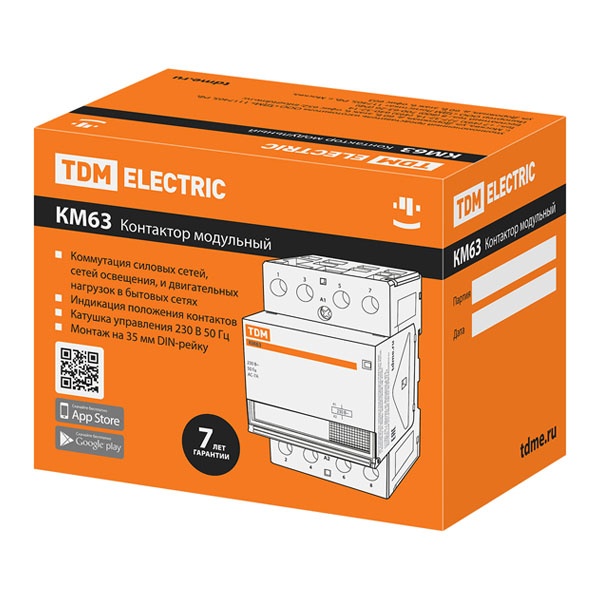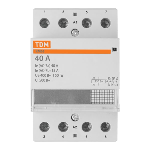 • Контактор модульный TDM КМ63/4-40А 3НО;1НЗ 230В АС 3 модуля