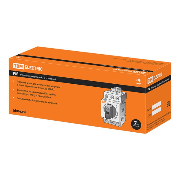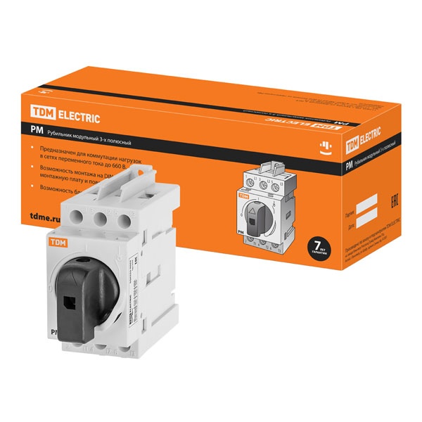 Назначение:Проведение тока в нормальном режиме. Частое оперативное включение и выключение электрической цепи. Применение:Вводно-распределительные устройства для жилых и общественных зданий. Пункты управления отдельными нагрузками: двигателями, насосами, станками и т. д. Преимущества:Механизм быстрого включения и отключения. Двойной разрыв каждой фазы. Номинальное выдерживаемое импульсное напряжение 8 кВ. Повышенная коммутационная способность АС-23 А позволяет использовать рубильник для нагрузок смешанного типа и электродвигателей. Материалы:Корпус рубильника выполнен из негорючего полиамида, армированного стекловолокном (PA6.6). Контактная группа рубильника выполнена из электротехнической меди с гальваническим покрытием, что предотвращает ее окисление в процессе эксплуатации. Упаковка:РМ-16 по 6 шт. РМ-20 по 6 шт. РМ-25 по 6 шт. РМ-40 по 6 шт. РМ-63 по 6 шт. РМ-80 по 4 шт. РМ-100 по 4 шт. РМ-125 по 4 шт.
