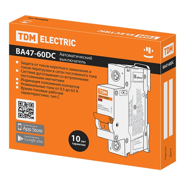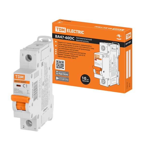 Автоматический выключатель от известной торговой марки ТДМ относится к серии модульных устройств ВА47-60DC. Это компактный и современный агрегат, который обеспечивает защиту электрической цепи от превышения максимально разрешенного рабочего тока и токов короткого замыкания. Также такой прибор позволяет выполнять разрыв цепи вручную, если возникнет такая необходимость. Простота монтажа на DIN-рейку.