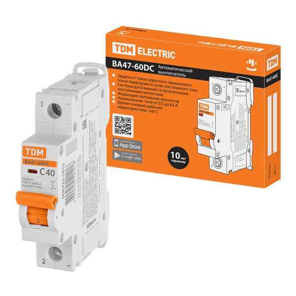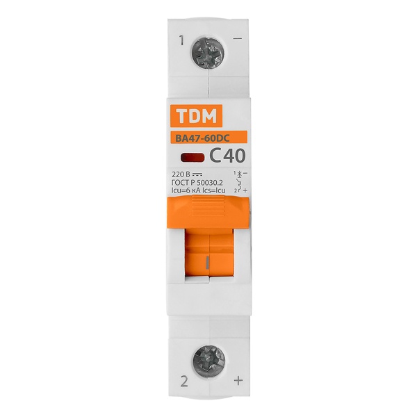 Однополюсный электрический автомат постоянного тока 40А, ПКС 6000А, характеристика расцепителя С, ТДМ ВА47-63 SQ0223-1015