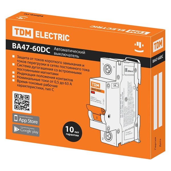 Автоматический выключатель от известной торговой марки ТДМ относится к серии модульных устройств ВА47-60DC. Это компактный и современный агрегат, который обеспечивает защиту электрической цепи от превышения максимально разрешенного рабочего тока и токов короткого замыкания. Также такой прибор позволяет выполнять разрыв цепи вручную, если возникнет такая необходимость. Простота монтажа на DIN-рейку.