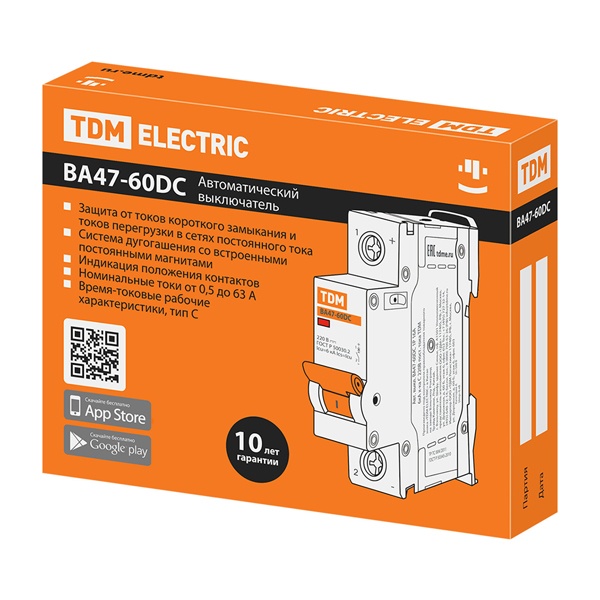 Автоматический выключатель от известной торговой марки ТДМ относится к серии модульных устройств ВА47-60DC. Это компактный и современный агрегат, который обеспечивает защиту электрической цепи от превышения максимально разрешенного рабочего тока и токов короткого замыкания. Также такой прибор позволяет выполнять разрыв цепи вручную, если возникнет такая необходимость. Простота монтажа на DIN-рейку.