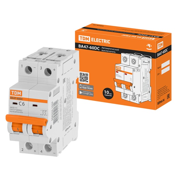 Автоматический выключатель от известной торговой марки ТДМ относится к серии модульных устройств ВА47-60DC. Это компактный и современный агрегат, который обеспечивает защиту электрической цепи от превышения максимально разрешенного рабочего тока и токов короткого замыкания. Также такой прибор позволяет выполнять разрыв цепи вручную, если возникнет такая необходимость. Простота монтажа на DIN-рейку.