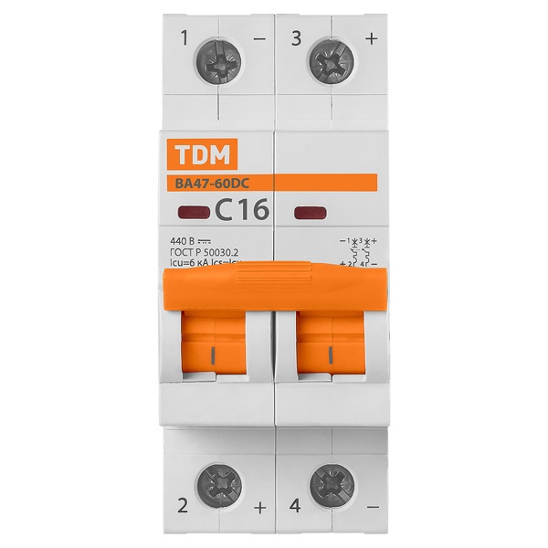 Двухполюсное токоограничевающее устройство постоянного тока, номинальная нагрузка 16А, ПКС 6кА, характеристика расцепителя С, ТДМ серии ВА47-63. SQ0223-1028