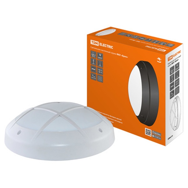Данный светильник от известной компании TDM Electric представляет собой накладную модель Бриз 2 серии ФБУ, которая предназначена для декоративного наружного освещения или подсветки фасадов зданий, а также внутреннего освещения помещений жилого и общественного назначения. Внешне она обладает компактным дизайном круглой формы в современном исполнении белого цвета и состоит из выпуклого плафона и корпуса с матовым покрытием. Материалом изготовления конструктивных элементов выступает полистирол. Светильник излучает мягкий рассеянный свет, который приятен глазу. Диаметр прибора составляет 30 см, а общая высота – 8.6 см. Масса изделия равна 0.96 кг. В качестве используемого источника света могут применяться компактные люминесцентные лампы до 20 Ватт или светодиодные на 12 Ватт. Такая модель рассчитана на установку двух энергосберегающих источников в керамический патрон с цоколем Е27. Питающее напряжение сети для светильника составляет 230 Вольт частотой 50 Герц. Особенностью модели является влагозащищенный корпус с надежной степенью защиты IP64. Его применение возможно в диапазоне температур от -45 до +50 градусов. Для дополнительной защиты от механического воздействия на конструкции прибора имеется защитная решетка, а для герметизации ввода проводников предусмотрен сальник. Прибор упакован в индивидуальную фирменную коробку и снабжен необходимой информацией.