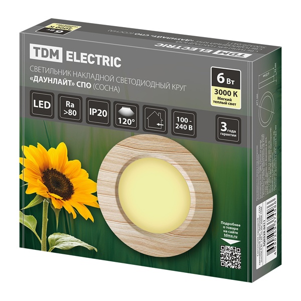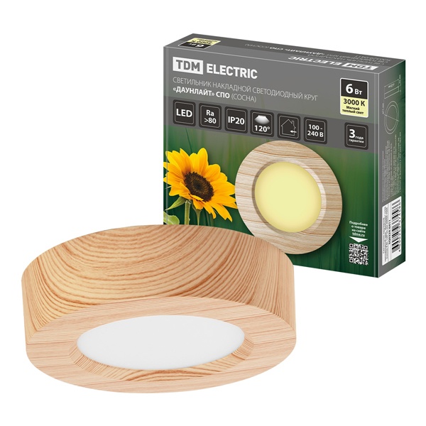 • Светильник светодиодный TDM накладной круг Даунлайт СПО 6 Вт 3000K (сосна) 120х32мм