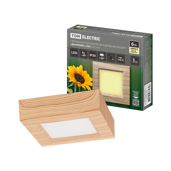 • Светильник светодиодный TDM накладной квадрат Даунлайт СПО 6 Вт 3000K (сосна) 120х120х32мм