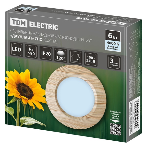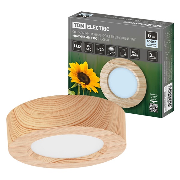 • Светильник светодиодный TDM накладной круг Даунлайт СПО 6 Вт 4200K (сосна) 120х32мм