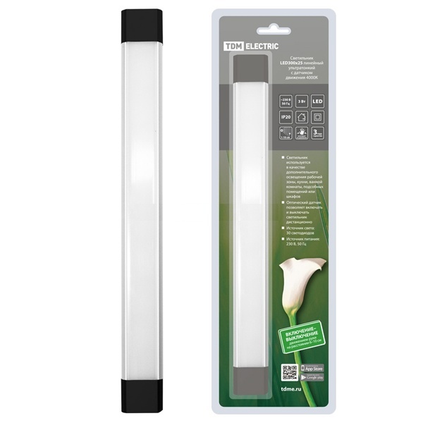 Этот линейный светильник TDM LED 300×25 — из тех, что ставят один раз и потом просто забывают: свет есть, включение удобное, места почти не занимает. Ультратонкий корпус хорошо «прячется» под полкой или в нише, а IR-сенсор избавляет от лишних движений, когда руки заняты.