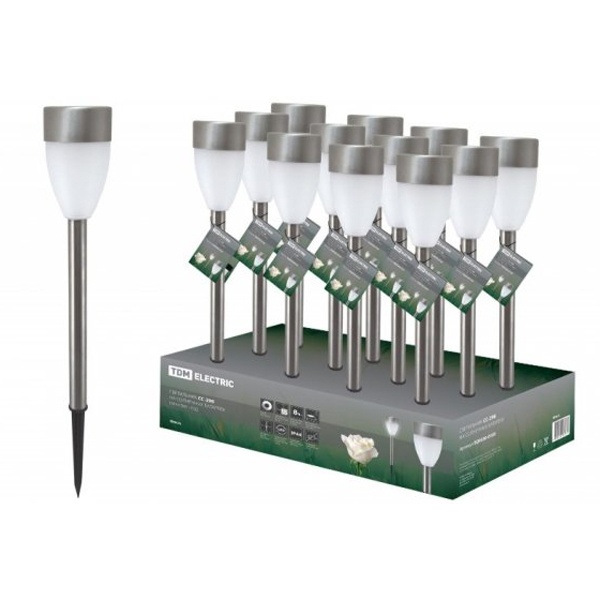 Назначение:Предназначены для декоративной подсветки ландшафных композиций. Преимущества:Не требуют подключения к сети: безопасность применения, отсутствие расходов на электроэнергию. Встроенный фотоэлемент автоматически включает светильник с наступлением темноты и выключает в светлое время суток. Светильники защищены от дождя, подходят для установки на улице – по степени защиты от пыли и влаги соответствуют IP44. Заряда батареи хватает на 8 часов непрерывной работы. К каждому светильнику прилагается паспорт, где подробно указаны правила эксплуатации светильников. Источником света в светильниках данной серии служат не требующие замены светодиоды – ресурс работы до 100 000 часов. Конструкция:Аккумуляторная батарея. Материалы:В зависимости от типа исполнения Упаковка:Коробка из картона Сегментированный бокс