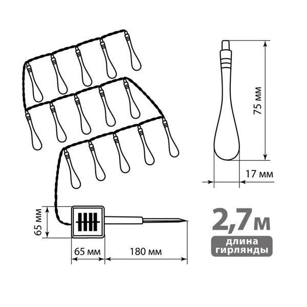 Гирлянда на солнечной батарее ССГ — это стильное и энергоэффективное решение для украшения вашего сада, террасы или балкона. Она оснащена 20 светодиодами, излучающими разноцветный свет, который создаёт уютную атмосферу. Длина гирлянды составляет 2.7 метра, что позволяет оформить значительную площадь или подчеркнуть элементы ландшафтного дизайна.
