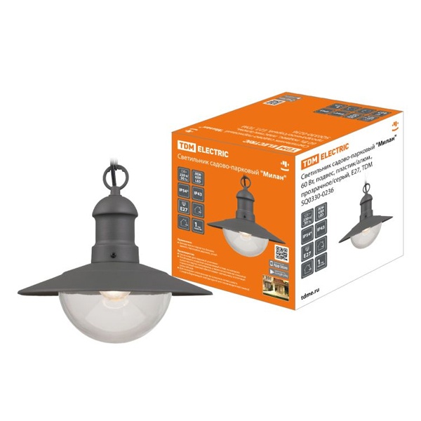 Светильник садово-парковый "Милан" 60 Вт, подвес, пластик/алюм., прозрачное/серый, Е27, TDM Electric