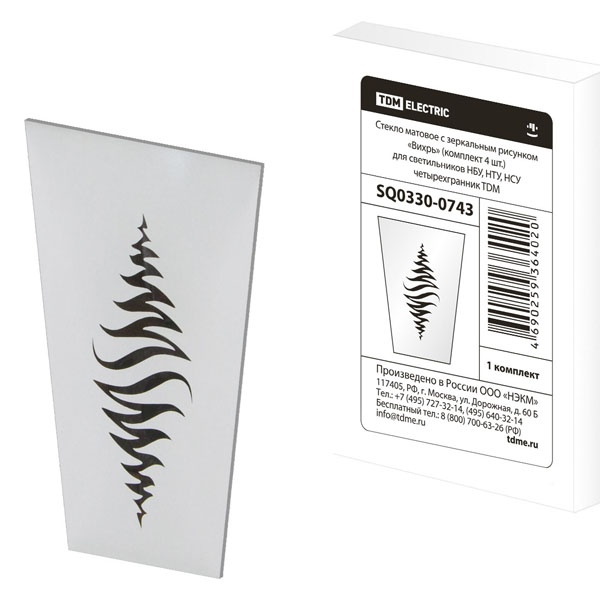 Декоративный набор стекол от известной компании TDM Electric представляет собой комплект из 4 элементов с зеркальным изображением «Вихрь». Он рассчитан на установку в осветительные приборы наружного типа серий НБУ, НТУ и НСУ, которые служат для внешнего оформления садов, участков, парков, скверов, зон отдыха и ресторанов. Осветительные приборы имеют форму четырехгранника и обладают разными типами монтажа. Декоративные боковые стенки создают индивидуальный стиль и неповторимый дизайн изделий. Они имеют матовое покрытие, которое комфортно для восприятия. С его помощью обеспечивается мягкое рассеянное свечение. Также стекло защищает источник света от попадания мусора, пыли и влаги внутрь конструкции, тем самым увеличивается продолжительность службы светильника. Удобство такого комплекта состоит в том, что при желании его можно заменить на простой матовый без нанесения изображения или с другим рисунком.Стекло в виде трапеции имеет параметры:ширина верхней грани – 9.7 см;ширина нижней грани – 6.3 см;высота – 13 см.Комплект упакован в коробку с индивидуальным стикером и снабжен необходимой информацией по установке и эксплуатации. Масса набора составляет 310 г.