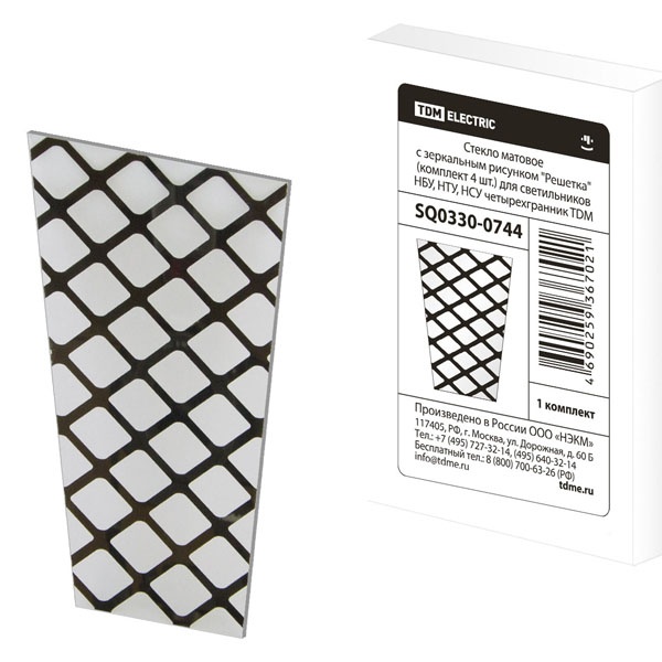 Для защиты источника света и внешнего оформления светильников используется комплект стекол, служащих боковыми стенками в конструкции четырехгранного фонаря. Данный набор известной торговой марки TDM Electric состоит из 4 элементов и представляет собой декоративные стекла с зеркальным рисунком в виде решетки. Они рассчитаны на установку в светильники серий НБУ, НТУ и НСУ с различным типом монтажа, которые используются для садово-паркового оформления, а также частных жилых территорий или других мест общественного назначения: зон отдыха, кафе, ресторанов и террас. Зеркальный рисунок «Решетка» создает индивидуальный стиль осветительному прибору и эффектно смотрится в пространстве. Каждый элемент имеет матовое покрытие, которое издает рассеянный мягкий свет, приятный для глаз.Стекло в виде трапеции имеет следующие параметры:ширина верхней грани – 9.7 см;ширина нижней грани – 6.3 см;высота – 13 см.Главной особенностью комплектов данной серии является возможность их замены на набор стекол с другим изображением или без него. Комплект упакован в коробку и снабжен стикером со штрих-кодом и всей необходимой информацией по монтажу и эксплуатации.