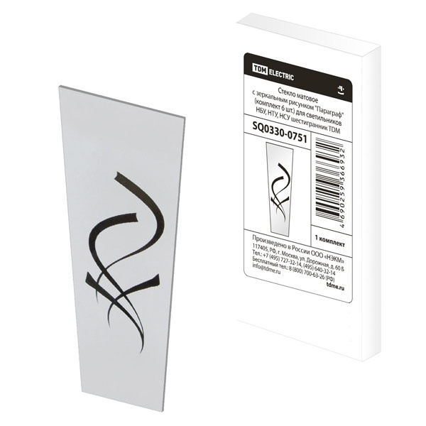 Набор стекол с зеркальным рисунком от известной компании TDM Electric представляет собой комплект декоративного стекла для установки в шестигранный светильник садово-паркового назначения. В набор входит 6 стекол, которые подходят для осветительных приборов серий НБУ, НТУ и НСУ. Светильники могут размещаться внутри помещений или создавать декоративное оформление участков жилого назначения, общественных мест: ресторанов, кафе и коттеджей. Каждый элемент комплекта имеет матовое покрытие и форму трапеции с нанесенным на нее изображением в виде параграфа. Такой акцент подчеркивает индивидуальный стиль фонарей, а матовое покрытие создает мягкий рассеянный свет, который приятен для глаз.Стекло имеет следующие размеры:ширина верхней грани – 6 см;ширина нижней грани – 4 см;высота – 14.7 см.Стекла, используемые в качестве боковых стенок светильника, выполняют также защитную функцию источника света и предотвращают попадание пыли и влаги внутрь корпуса. Комплект упакован в индивидуальную коробку с нанесенной на нее информацией и стикером со штрих-кодом. При желании декоративные стекла с зеркальным рисунком можно поменять на комплект с другим изображением или простым матовым покрытием без рисунка. Масса набора составляет 320 г.