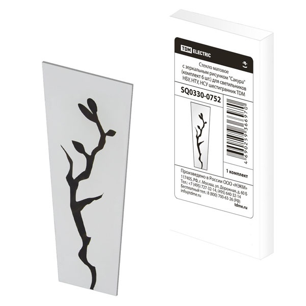 Комплект декоративных стекол от известной компании TDM Electric, который включает в себя 6 элементов, предназначен для установки в садово-парковые светильники в форме шестигранника. Он рассчитан на модели осветительных приборов серий НБУ, НТУ и НСУ различного типа установки, которые применяются для внешнего оформления жилых участков или общественных мест: бульваров, скверов, парков, садов и террас. Каждое стекло обладает одинаковой формой в виде трапеции и декорировано зеркальным изображением сакуры. Помимо внешнего оформления светильников, стекла выполняют защитную функцию источника света, предотвращая попадание влаги и пыли внутрь конструкции. Матовое покрытие поверхности обеспечивает мягкое и рассеянное свечение, которое комфортно для восприятия.Габаритные параметры стекла:ширина верхней грани – 6 см;ширина нижней грани – 4 см;высота – 14.7 см.Декоративное оформление придает изысканный внешний вид и подчеркивает индивидуальный стиль светильника. Комплект упакован в коробку с индивидуальным стикером и снабжен всей необходимой информацией по монтажу и эксплуатации. Масса набора составляет 320 г.