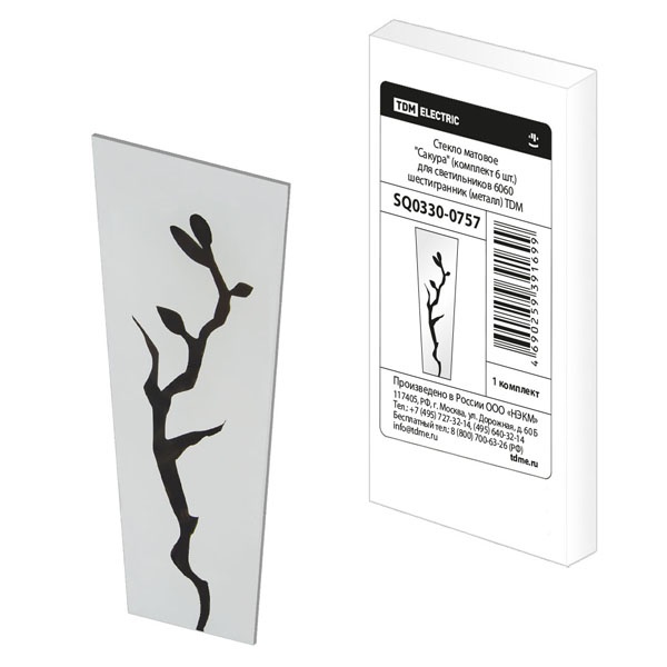 Комплект декоративных стекол от известной компании TDM Electric, который включает в себя 6 элементов, предназначен для установки в садово-парковые светильники в форме шестигранника. Он рассчитан на металлические модели осветительных приборов серии 6060, отличающиеся цветом и способом установки. Их применяют для внешнего оформления дачных участков или общественных мест: бульваров, скверов, парков, садов и террас. Каждое стекло обладает одинаковой формой в виде трапеции и декорировано зеркальным изображением сакуры. Помимо внешнего оформления светильников, стекла выполняют защитную функцию источника света, предотвращая попадание влаги и пыли внутрь конструкции. Матовое покрытие поверхности обеспечивает мягкое и рассеянное свечение, которое комфортно для восприятия.Габаритные параметры стекла:ширина верхней грани – 6 см;ширина нижней грани – 4 см;высота – 15 см.Декоративное оформление придает изысканный внешний вид и подчеркивает индивидуальный стиль светильника. Комплект упакован в коробку с индивидуальным стикером и снабжен всей необходимой информацией по монтажу и эксплуатации. Масса набора составляет 320 г.