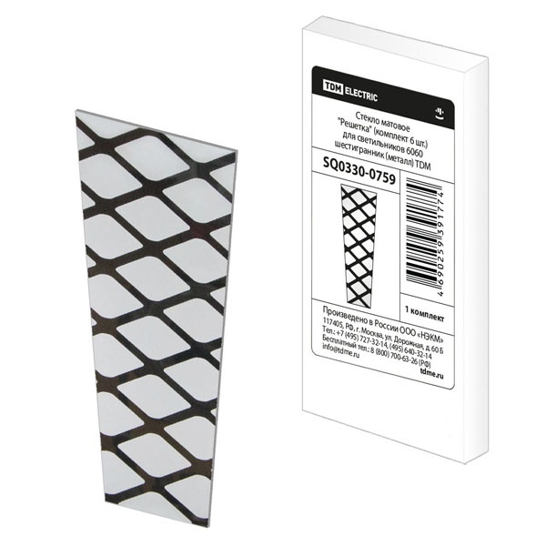 Для защиты источника света и внешнего оформления осветительных приборов используется комплект стекол, служащих боковыми стенками в конструкции шестигранного фонаря. Данный набор известной торговой марки TDM Electric состоит из 6 элементов и представляет собой декоративные стекла с зеркальным рисунком в виде решетки. Они рассчитаны на установку в классические светильники серии 6060 из металла, которые используются для садово-паркового оформления, а также частных жилых территорий или других мест общественного назначения: зон отдыха, кафе, ресторанов и террас. Зеркальный рисунок «Решетка» придает индивидуальности осветительному прибору и эффектно смотрится в пространстве. Каждый элемент имеет матовое покрытие, которое издает рассеянный мягкий свет, приятный для глаз.Стекло в виде трапеции имеет следующие параметры:ширина верхней грани – 6 см;ширина нижней грани – 4 см;высота – 15 см.Главной особенностью комплектов данной серии является возможность их замены на набор стекол с другим изображением или без него. Комплект массой 320 г упакован в коробку и снабжен стикером со штрих-кодом и всей необходимой информацией по монтажу и эксплуатации.