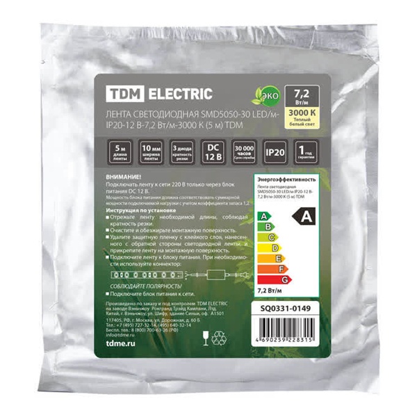 - Гарантия качества. Каждый отрезок светодиодной ленты промаркирован знаком “TDM”, что гарантирует защиту от подделок. На светодиодную ленту предоставляется гарантия 2 года.