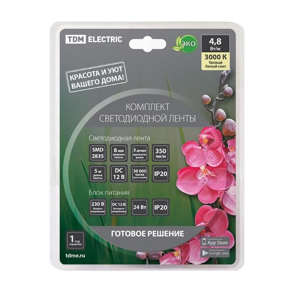 Комплект светодиодной ленты SMD2835-60 LED/м-12 В-4,8 Вт/м-IP20-3000 К (5 м), 24 Вт TDM Electric