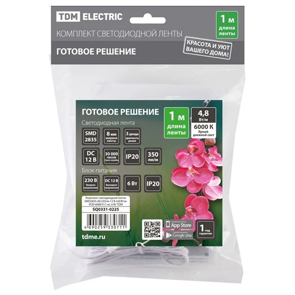 • Комплект светодиодной ленты TDM SMD2835-60 LED/m 4,8W/m 6000K 12V IP20 (упаковка 1 метр) 6W