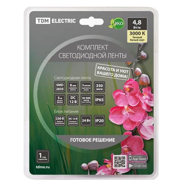 Комплект светодиодной ленты SMD2835-60 LED/м-12 В-4,8 Вт/м-IP65-3000 К (5 м), 24 Вт TDM Electric