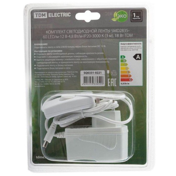 Комплект светодиодной ленты SMD2835-60 LED/м-12 В-4,8 Вт/м-IP65-3000 К (3 м), 18 Вт TDM Electric