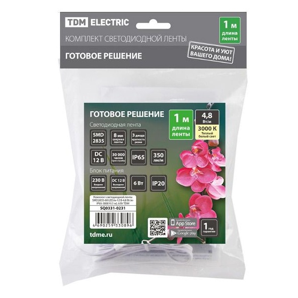 Комплект влагозащищенной, светодиодной ленты с адаптером ТДМ, мощностью 4,8 Ватт на метр, теплый белый свет, длина ленты 1 метр SQ0331-0231