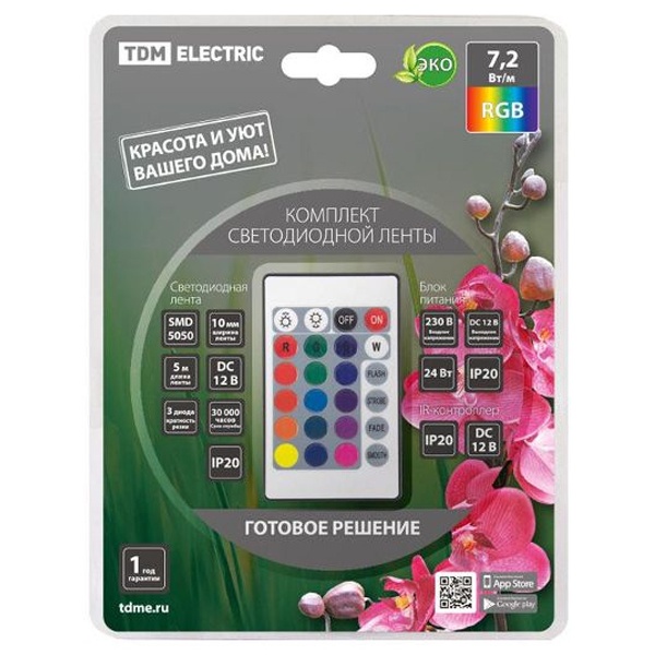 Комплект светодиодной ленты SMD5050-30 LED/м-12 В-7,2 Вт/м-IP65-RGB (5 м), 24 Вт, IR-контроллер TDM Electric