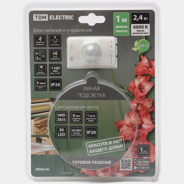 Назначение:Декоративное и контурное освещение. Применение:Простое решение монтажа светодиодной подсветки в квартире и на даче. Для подсветки мебели (шкафы, кровати), рабочих зон (кухня, кабинет), коридоров и подсобных помещений. Преимущества:В комплекте: светодиодная лента, блок питания, датчик движения Источник автономного питания не требует подключения к стационарной сети. Монтаж комплекта светодиодной ленты настолько прост, что его можно выполнить самостоятельно, не имея специальных навыков. Наличие в ассортименте светодиодных лент с цветовой температурой 3000 К и 6500 К (теплый белый и яркий дневной свет). Упаковка:Транспортная упаковка – картонная коробка. Блистер