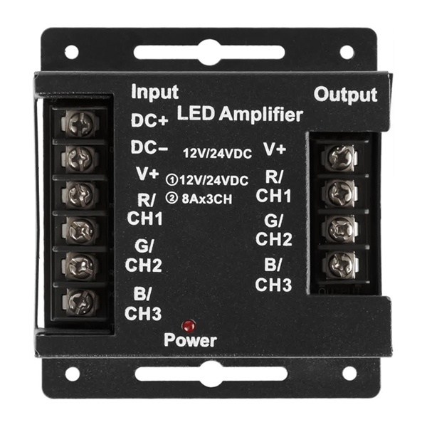 Усилитель предназначен для работы с RGB-светодиодными лентами и модулями, обеспечивая увеличение мощности сигнала и стабильность работы осветительных приборов. Он принимает управляющий сигнал от RGB-контроллера и передает его на подключенные ленты, позволяя расширить количество светодиодных лент, работающих от одного контроллера.