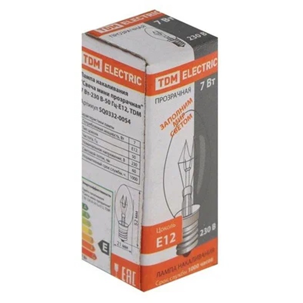 SQ0332-0054 Лампа накаливания свеча мини TDM 7 Вт 230 В Е12 50Гц прозрачная