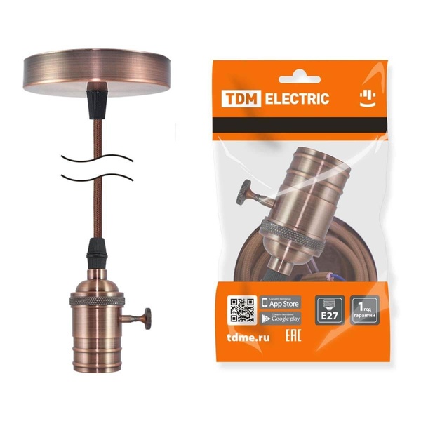 • Патрон Е27 TDM с выключателем с подвесом 1 м, металлический Лофт, медь