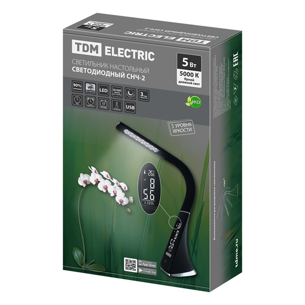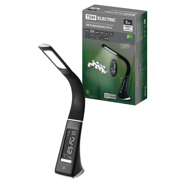 Светодиодный настольный светильник ТДМ, мощностью 5 Ватт, дневной свет, с регулировкой яркости, наличие электронного органайзера, черного цвета SQ0337-0099