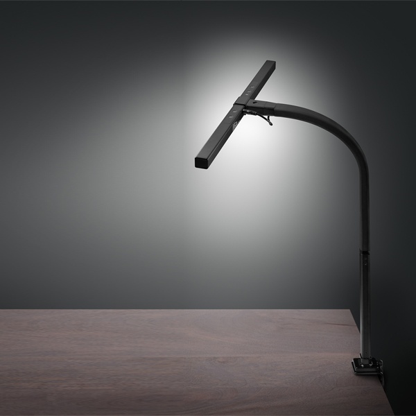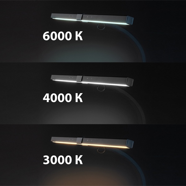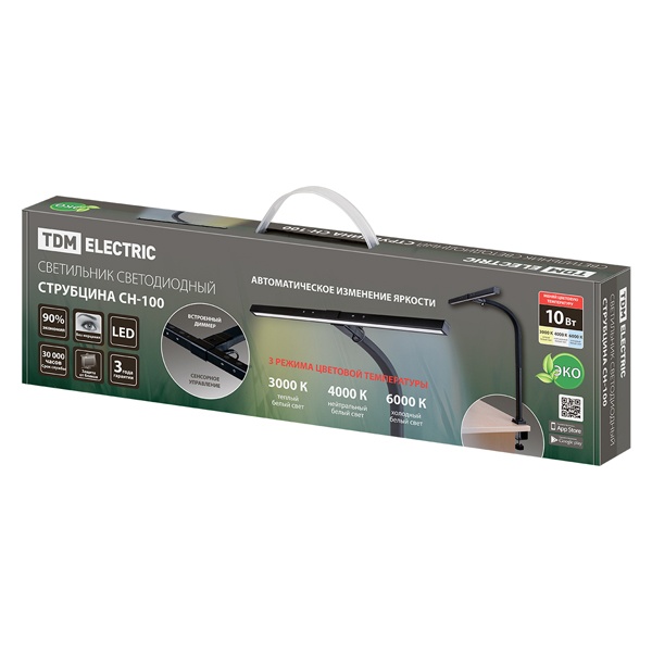 ПреимуществаАвтоматическая регулировка уровня яркости: изменение мощности светового потока в зависимости от общего уровня освещенности (на основе показаний встроенного датчика).Диммер цветовой температуры (3000, 4000 и 6000 К).Сенсорное управление.Высокая мощность светодиодов и гибкий кронштейн помогают настроить светильник таким образом, чтобы все рабочее пространство было освещено равномерно.Ассиметричная оптика для предотвращения бликов на мониторе.Индекс цветопередачи Ra>95% близок к уровню естественного освещения.Крепление-струбцина для экономии рабочего пространства на столе.Использование светодиодов позволяет сберечь до 90% электроэнергии.Технические характеристикиПотребляемая мощность - 10 ВтСветовой поток - 650 лмПитание - 220 ВЦветовая температура - 3000-4000-6000 КИндекс цветопередачи - >95%Срок службы светодиодов - 30 000 чДополнительные функции - 3-уровневый диммер цветовой температуры, бесступенчатый 5-кратный диммер яркости, автоматическое диммирование в зависимости от уровня освещенностиТип выключателя - сенсорТип кронштейна - гибкийДлина провода питания - 1,7 мЦвет корпуса - черный