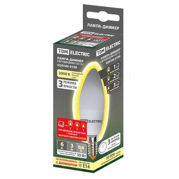 Светодиодная лампочка-диммер свеча ТДМ, со сменой режима яркости, максимальная мощность 6 Ватт, теплый свет SQ0340-0199