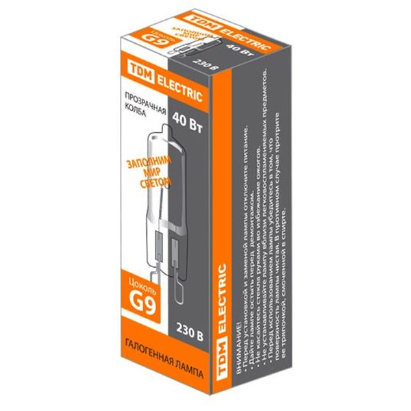 Назначение:Предназначены для местной подсветки и акцентного освещения в точечных светильниках, люстрах и бра. Преимущества:Высокая цветопередача и возможность создания привлекательных световых эффектов. Стабильно яркий свет на протяжении всего срока службы. Возможность диммирования. Малые габариты. Невосприимчивы к перепадам температур. Не содержат вредных веществ и не подлежат специальной утилизации. Срок службы 2 000 часов. Конструкция:Устанавливая галогенную лампу в электропатрон, необходимо полностью исключить контакт пальцев с колбой лампы. В противном случае возможен мгновенный выход из строя. Рекомендуется использовать с блоком защиты для галогенных ламп TM TDM ELECTRIC. Материалы:Колба: Кварцевое стекло Упаковка:Коробка из картона