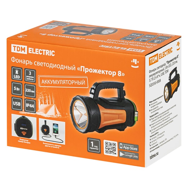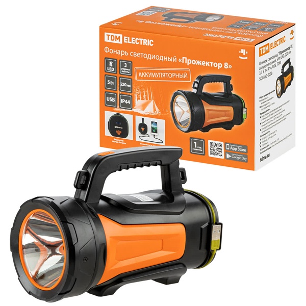 Аккумуляторный фонарь ТДМ Прожектор-8, светодиодный 5Вт с функцией PowerBank, 3 режима SQ0350-0008
