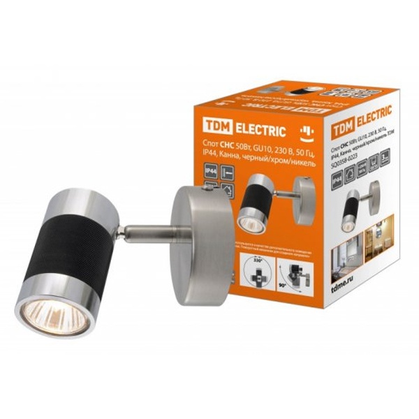 Данная модель светильника Канна от известной компании TDM Electric представляет собой одинарный спот стационарного типа настенно-потолочной установки, который предназначен для освещения ванных комнат, санузлов и кухонь. Такой тип осветительных приборов отличается надежной степенью защиты IP44, которая предполагает их размещение в помещениях с повышенной влажностью. Внешне светильник обладает стильным дизайном в современном исполнении и состоит из герметичного металлического корпуса и рассеивателя из поликарбоната. Корпус закрытого типа имеет черное, хромированное и никелированное цветовое исполнение. Особенностью модели является регулируемый угол наклона до 45 градусов и возможность поворота плафона на 315 градусов, которые обеспечивают удобство для подсветки локальной зоны интерьера. Спот рассчитан на установку 1 галогенной лампы GU10 мощностью до 50 Ватт, которая обеспечивает яркий и чистый свет с низким энергопотреблением. Питающее напряжение сети, на которое рассчитан прибор, составляет 230 Вольт частотой 50 Герц. Монтаж изделия производится на стены и потолки из стандартных строительных материалов с нормально воспламеняемой поверхностью. Наружный диаметр спота составляет 8 см, высота – 8 см, а глубина – 14.7 см.