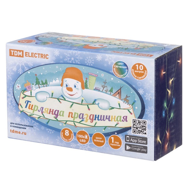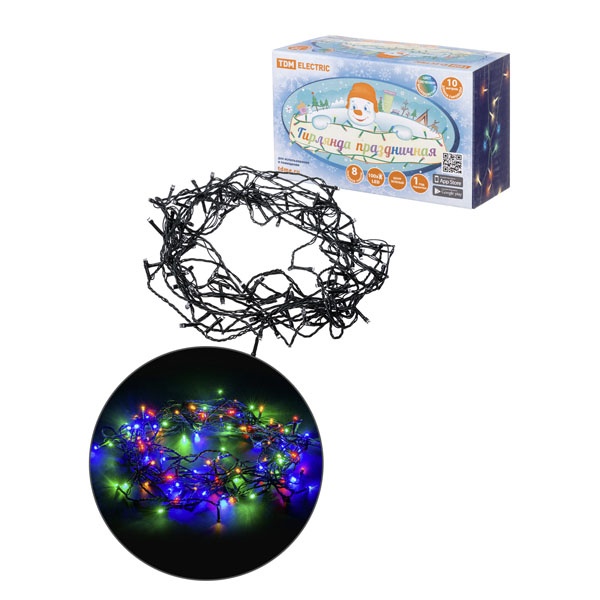 • Гирлянда светодиодная TDM СГ100МЗ10, многоцвет., зеленый шнур, 10м, 8 режимов, 250В, IP20