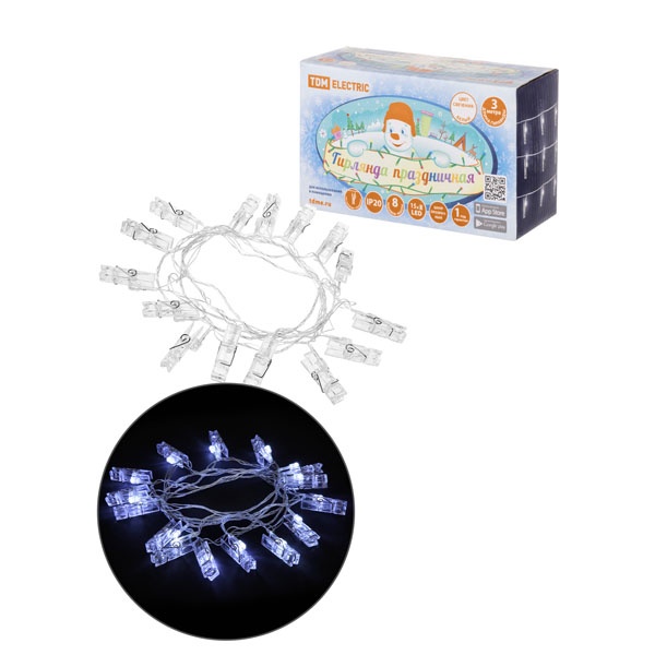 Гирлянда светодиодная "Прищепки" 3 м, 15LED, белый, 8 режимов, 250 В, IP20, TDM Electric