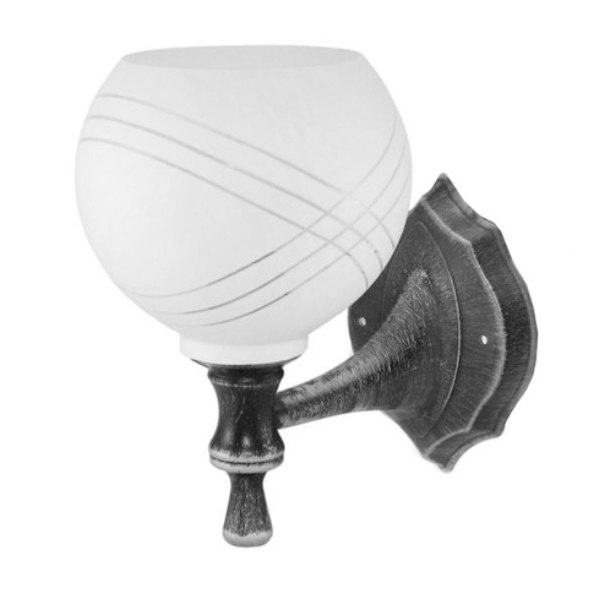 Настенный светильник серебрянно-черного цвета под лампы с цоколем Е27 мощностью до 60 Ватт с полусферическим белым плафоном с узором параллели, ТДМ НББ. SQ0370-0204