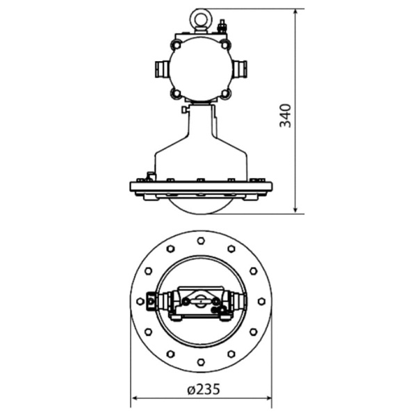 Монтаж светильника производится подвешиванием на рым-болт, с двумя вводами для проходного подключения.