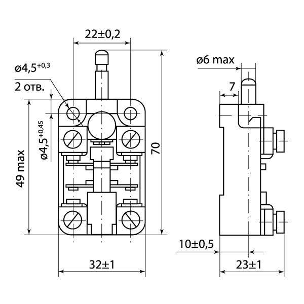 Контактное устройство торговой марки TDM Electric относится к серии ВПК и представляет собой путевой контактный выключатель в металлическом корпусе открытого типа. Он предназначен для коммутации цепей управления под воздействием управляющих упоров в определенных точках пути подконтрольного объекта. Контактор имеет 2 независимые электрические цепи и может работать как на переменном, так и на постоянном токе в повторно-кратковременном режиме. Внешне прибор представляет собой компактное устройство прямоугольной формы без степени защиты, но обладающее прочностью и высокой устойчивостью к коррозии. Контактная группа состоит из 1 разомкнутого и 1 замкнутого типа контактов, сделанных из меди с гальваническим покрытием. Выключатель рассчитан на ТОКОВУЮ нагрузку ДО 10 Ампер при номинальном напряжении переменного тока 660 Вольт, а в цепи постоянного тока – до 440 Вольт. Он приводится в действие с помощью толкателя. Полный ход штока составляет не более 8,5 мм, а прямой рабочий ход до 5,3 мм. Механическая износоустойчивость достигает 16 млн циклов. Срок службы изделия не менее 10 лет при соблюдении рабочего температурного режима от +1 до +40.Параметры переключателя:ширина – 3,2 см;длина – 4,9 см, с приводом – 5,8 см;глубина – 2,3 см.Аппарат промышленного назначения используется для лифтов, подъемников, строительных кранов, конвейеров, для устройств с автоматическим приводом.