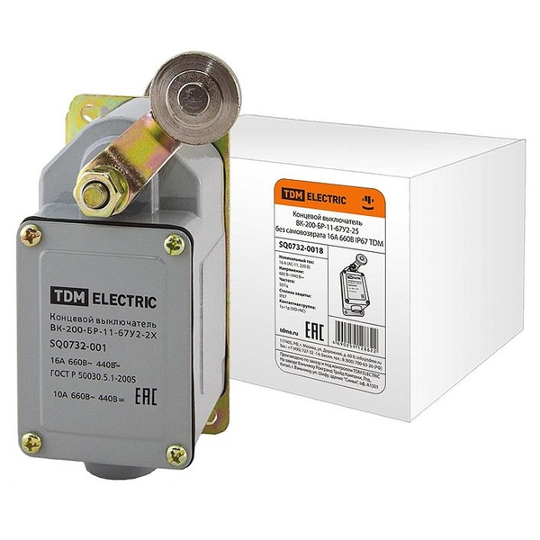 Аппарат торговой марки TDM Electric серии ВК-200 представляет собой концевой переключатель в металлическом корпусе, который предназначен для применения в электрических цепях управления, сигнализации и контроля относительного положения подвижных частей механизма в пространстве. Он рассчитан на ток до 16 Ампер при максимальном напряжении электроцепи переменного тока 660 Вольт, в цепи постоянного тока – 440 Вольт.Контактор приводится в действие с помощью роликового рычага без самовозврата. Для ввода внешних проводов предназначен сальник, который не входит в комплект и приобретается отдельно. При его установке конструкция имеет высокую степень защиты IP67, предотвращает от попадания грязи и влаги и устойчива к негативному влиянию окружающей среды. Прибор оснащен 1 разомкнутым и 1 замкнутым типом контактов, сделанных из меди с гальваническим покрытием. Устройство выдерживает до 600 включений и отключений в час и обладает механической износостойкостью до 1 млн циклов. Продолжительный срок службы составляет не менее 10 лет.Концевой выключатель имеет следующие размеры:длина – 12 см;ширина – 6 см;глубина – 6 см.Прибор промышленного назначения используется для лифтов, подъемников, строительных кранов, конвейеров и для устройств с автоматическим приводом.