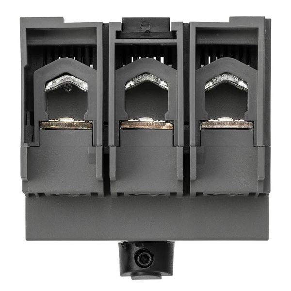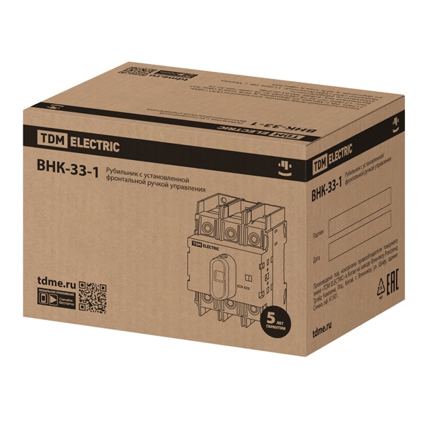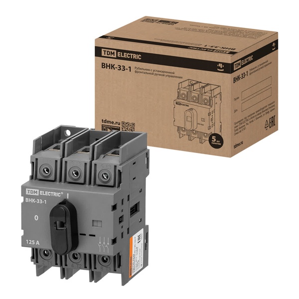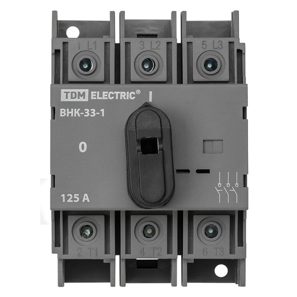 Трёхполюсный рубильник серии ВНК-33 предназначен для ручного коммутационного управления электрическими цепями переменного тока до 660 В и номинального тока до 630 А. Оснащён фронтальной ручкой управления, установленной на корпусе устройства, что обеспечивает удобство эксплуатации и безопасность при переключении.